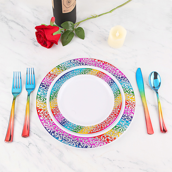 Set Size: 10.43""x4.13""x10.43"" Weight: 4.95lb/pack Color: rainbow clolor Material: PS Product Description: Enjoylife's target: our goods can enlightening your life and make your life more brighter. Recyclable and BPA Free: The rainbow party plates are healthy and safety to any kind of food. Best Quality: Extra heavy weight in the dinner plate and salad/dessert plates,Strong & Durable. These plastic plates will hold heavy portions of food and are great for outdoor events. Unique Feeling: The wedding plates is white color with rainbow color which is special in the market. The swirling border adds that extra bit of elegance and class to the tables. The high gloss finish on these dinner plates for parties looks just like china or porcelain. NOTE & TIPS: After party you can dispose these disposable party plates, dishwasher and microwave are not recommend. If you try to keep them and reuse them, please hand wash and dry them after using , Stored in dry place for its durability. BEST CUSTOMER SERVICE TEAM Contact us if you are not satisfied with the rose gold disposable plates and cutlery, we’ll process full refund or send you a replacement without returning or any additional conditions.