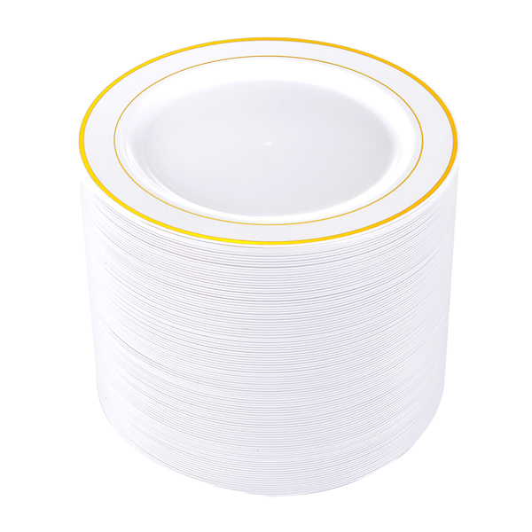 Perfect for any occasion: This gold plastic dinner plates are simply dazzling with a universal appeal that will complement your any party theme.These heavyweight plastic gold plates are designed to withstand even the most temperature intensive foods while maintaining their form and shape. They will last through the entire meal till they are thrown out, or washed and reused for the next meal. Save clean-up time by throwing them out after use, while still enjoying the decorative and elegant accent they add to your event.