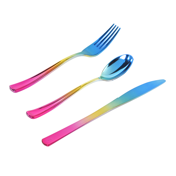 Enjoylife's rainbow gold cutlery set is an absolutely new and unique products. The exclusive color make the goods elegant, pretty beautiful which can suit for any holiday party, wedding, birtyday and so on any occassions. And it also can use to picnic and any other outdoor use. The proper size and weight can use to any kind of food too. After the dinner, pls throw them away which can save the time and let's to enjoy more time in the party. Hope our goods can enlightening your life and make your time in happy.