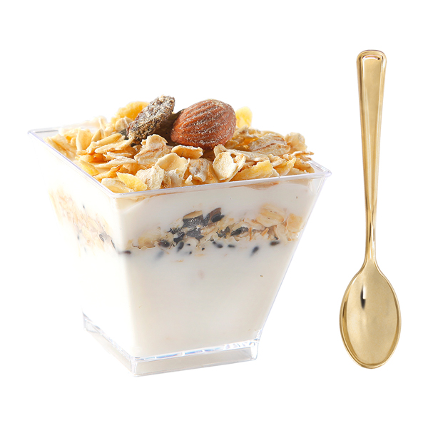 Recyclable and BPA Free: The gold plastic spoons and square cups are healthy and safety to any kind of food.They are BPA free and PDA approved. We use the 100% pure PS material to the goods.