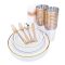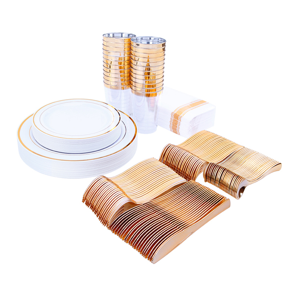 Best Quality: Extra heavy weight in the dinner plate and salad/dessert plates, gold knife, fork and spoon are also in heavy weight and proper size which can match all sorts of food.the linen napkin is very thin and good look to match any kind of event. It also have the big volume of tumbler. the gold plastic cups have 12oz which can suit for any of drink